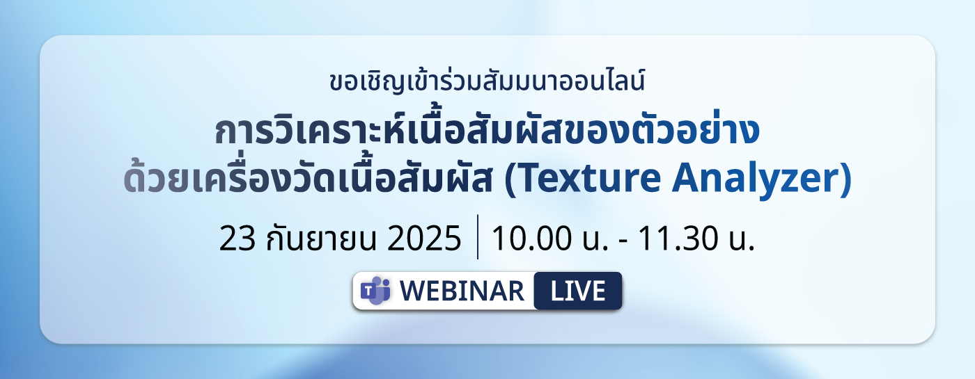 งานสัมมนาออนไลน์ หัวข้อ “การวิเคราะห์เนื้อสัมผัสของตัวอย่างด้วยเครื่องวัดเนื้อสัมผัส (Texture Analyzer)” ในวันอังคารที่ 23 กันยายน พ.ศ. 2568 ตั้งแต่เวลา 10.00 – 11.30 น.