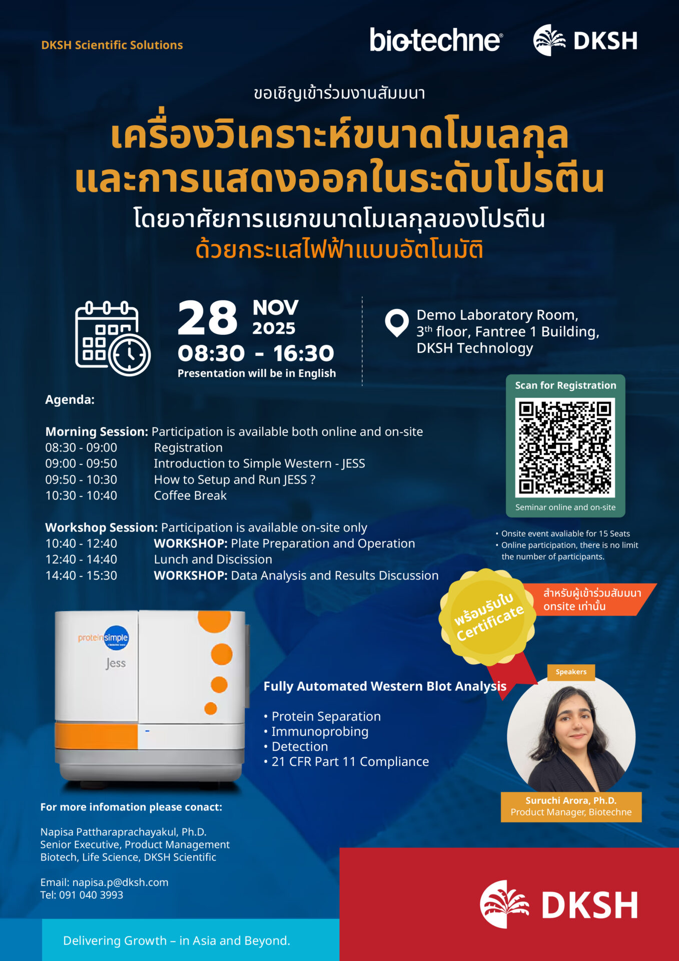 DKSH และ Biotechne ขอเชิญทุกท่านเข้าร่วมงานสัมมนา หัวข้อ "เครื่องวิเคราะห์ขนาดโมเลกุลและการแสดงออกในระดับโปรตีน โดยอาศัยการแยกขนาดโมเลกุลของโปรตีน ด้วยกระแสไฟฟ้าแบบอัตโนมัติ" ในวันศุกร์ที่ 28 พฤศจิกายน พ.ศ. 2568 เวลา 08.30 - 16.30 น.