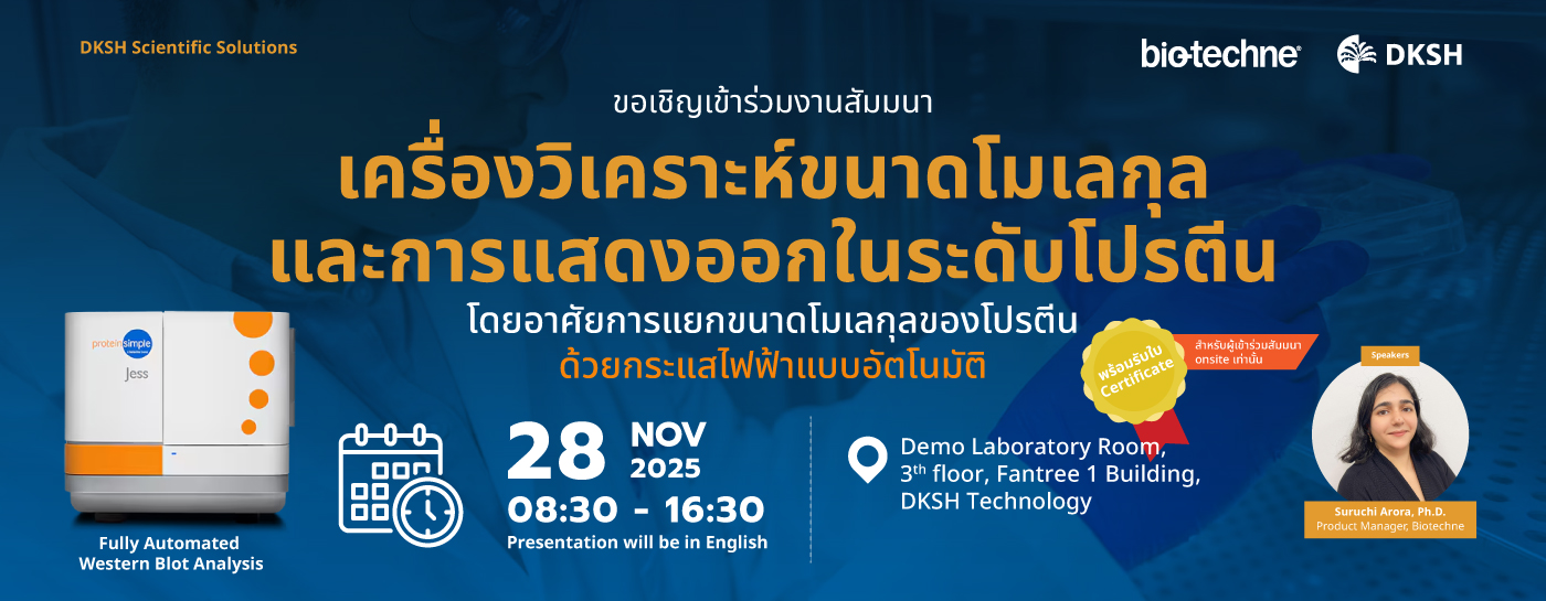 เปิดลงทะเบียนแล้ว! งานสัมมนาจาก Biotechne ในหัวข้อ “เครื่องวิเคราะห์ขนาดโมเลกุลและการแสดงออกในระดับโปรตีน โดยอาศัยการแยกขนาดโมเลกุลของโปรตีน ด้วยกระแสไฟฟ้าแบบอัตโนมัติ” ในวันศุกร์ที่ 28 พฤศจิกายน พ.ศ. 2568 เวลา 08.30 – 16.30 น.
